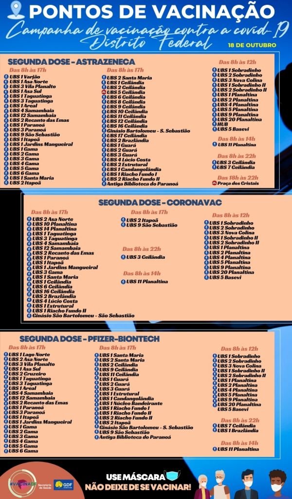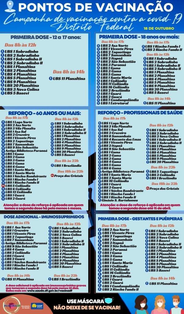 A Secretaria de Saúde retoma nesta segunda-feira (18/10) a vacinação de D2 e dose de reforço contra a Covid-19 em todas as cidades do DF. No fim de semana, foram abertos seis postos no total em localidades específicas.