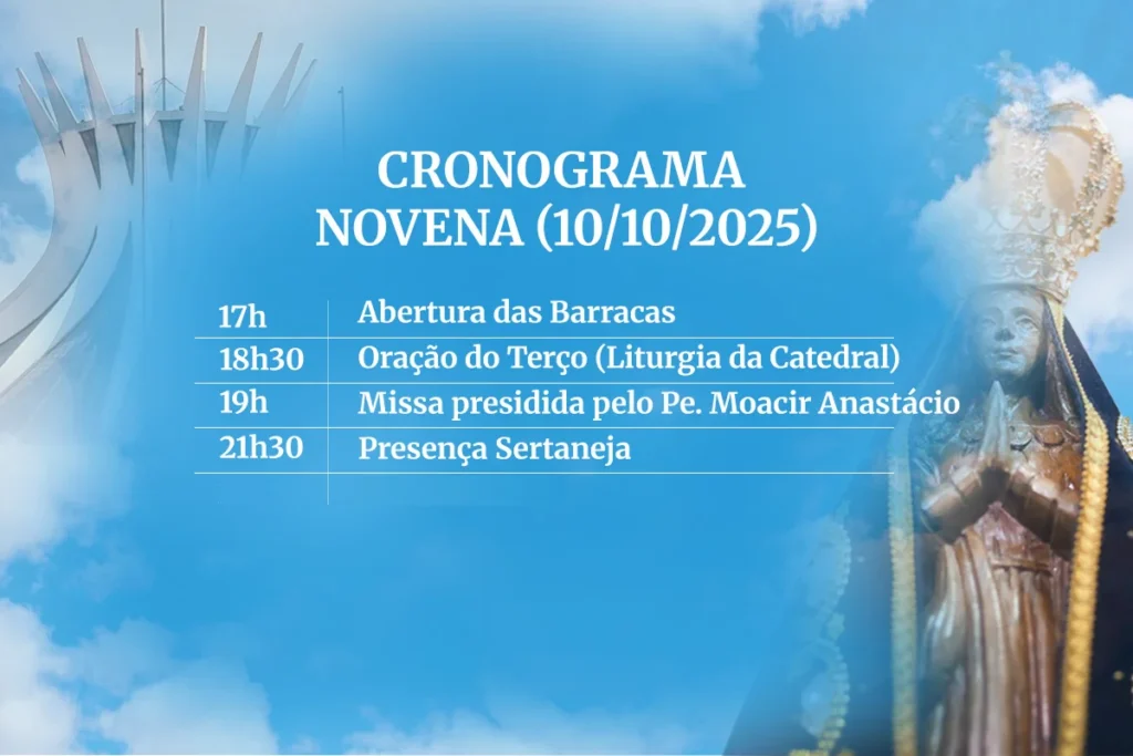 De 3 a 11 de outubro, será realizada a novena em honra a Nossa Senhora Aparecida, com a Santa Missa diária sendo presidida por diversos sacerdotes e Bispos convidados. As celebrações, do dia 3 ao dia 9, ocorrerão às 19h, dentro da Catedral Metropolitana de Brasília, precedidas pela oração do Santo Terço, às 18h30.