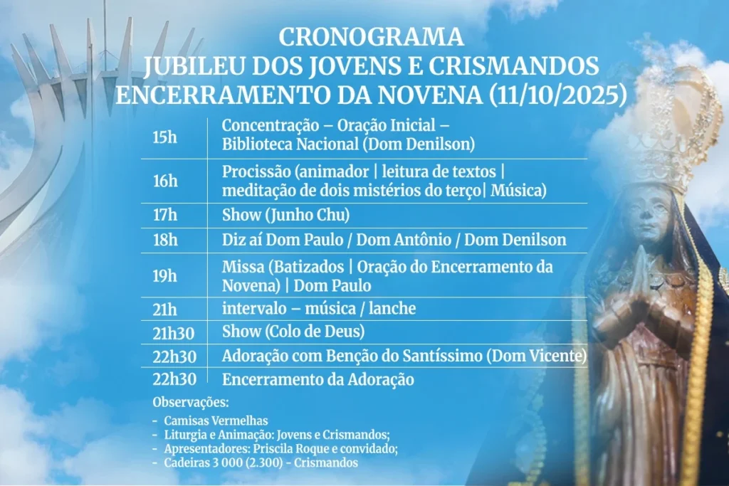 Três peregrinações do Jubileu 2025 também serão realizadas no espaço: Crismados e jovens, crianças e Movimentos Marianos.