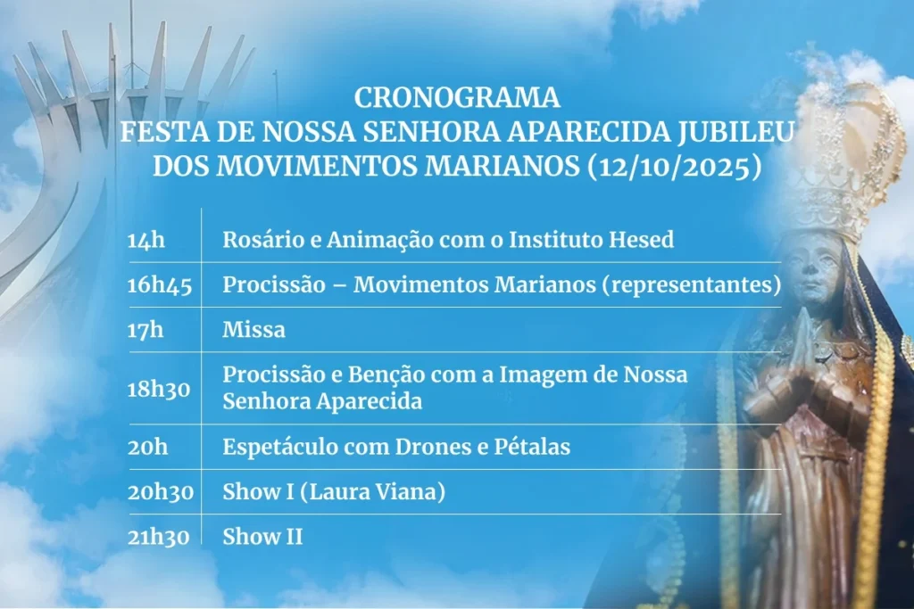 A tradicional Festa de Nossa Senhora Aparecida, na Esplanada dos Ministérios, chega à 27ª edição em 2025. Organizada pela Catedral Metropolitana de Brasília, a celebração deste ano terá o tema Maria, Mãe da Esperança.