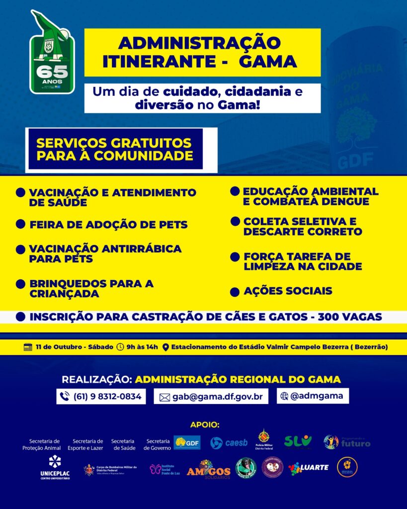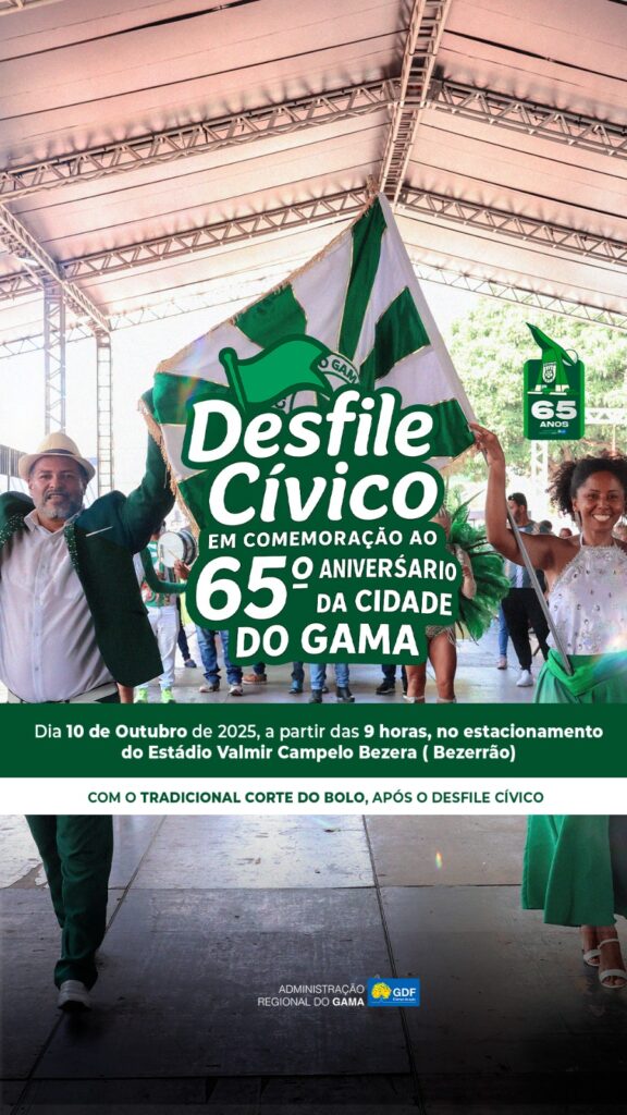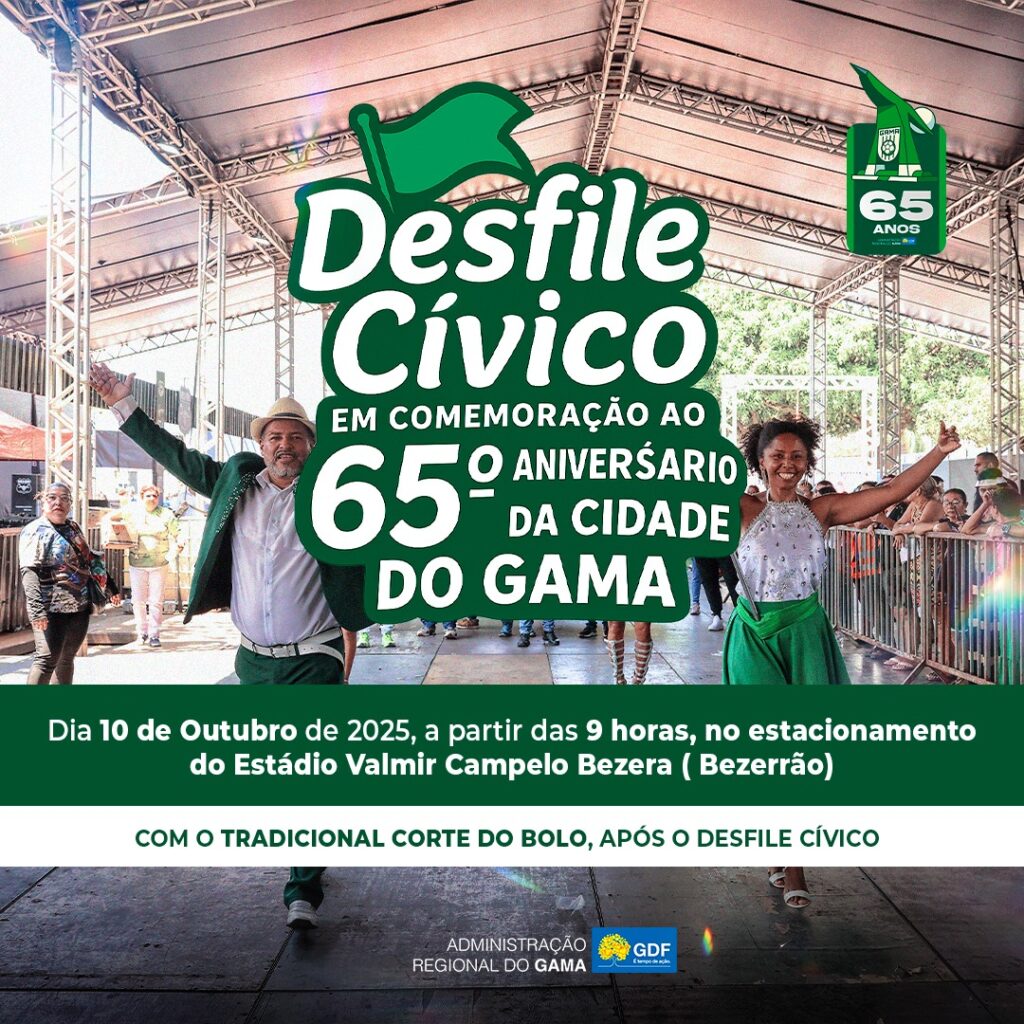 É com grande entusiasmo que a Administração Regional do Gama convida toda a comunidade para celebrar o 65º aniversário da nossa amada cidade! Preparamos uma programação imperdível, cheia de serviços gratuitos, cultura e diversão para todos.