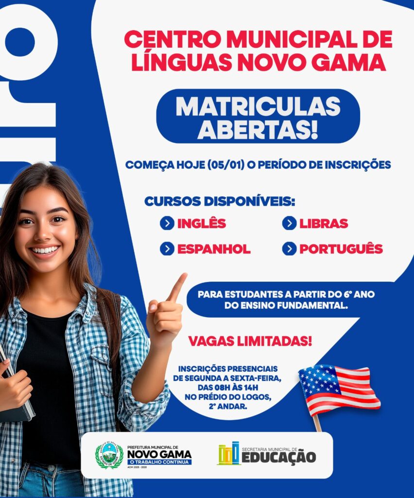 Estão sendo ofertados cursos de Inglês, Espanhol, Português e Libras, voltados para estudantes a partir do 6º ano do Ensino Fundamental. A iniciativa reforça o compromisso da Prefeitura de Novo Gama, por meio da Secretaria Municipal de Educação, com a ampliação do acesso ao ensino de línguas e à inclusão educacional.