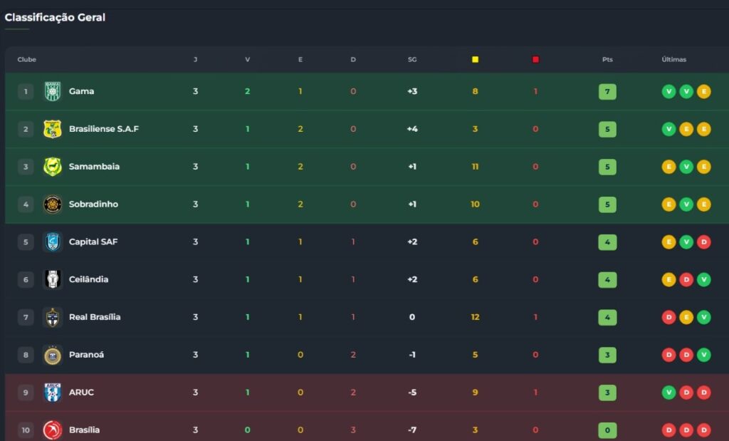 As equipes estão invictas no campeonato. O Gama lidera o torneio, com sete pontos, enquanto o Brasiliense está logo atrás, com cinco. Veja tabela: