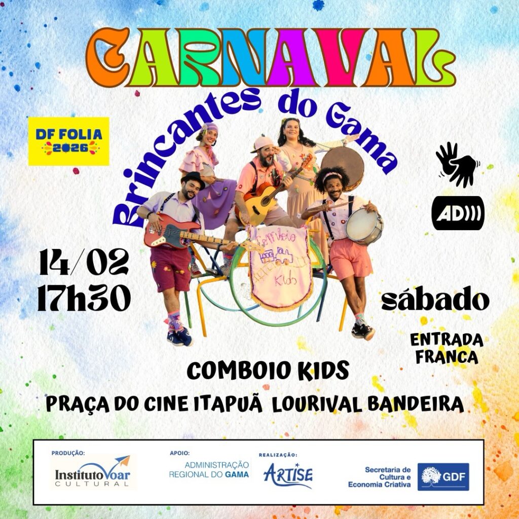 O Carnaval dos Brincantes do Gama chega à edição de 2026 com uma programação voltada para todas as idades, reunindo música, cortejo e manifestações da cultura popular brasileira. Neste sábado, 14 de fevereiro, a partir das 16h, a Praça Lourival Bandeira, conhecida como Cine Itapuã, será ponto de encontro de famílias, artistas e moradores da região.