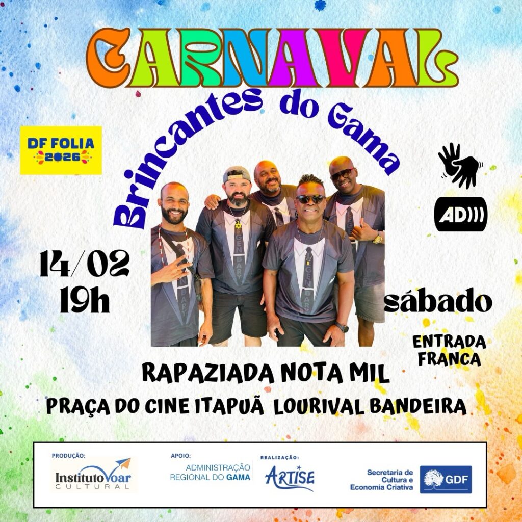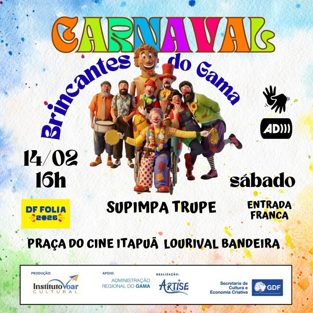 A programação integra o DF Folia 2026 e, neste ano, é realizada pela Organização da Sociedade Civil Associação Artise de Arte, Cultura e Acessibilidade, por meio de termo de colaboração com a Secretaria de Cultura e Economia Criativa do Distrito Federal. Ao todo, o DF Folia contará com 73 blocos espalhados por diversas regiões administrativas, além de três territórios fixos com programação durante o feriado. O evento no Gama tem apoio da Administração Regional.